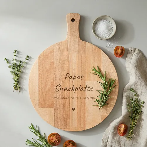 - Papas SnackplatteEigener Name · Holz oder PlexiglasIst Ihr Vater der unangefochtene „König der Snacks“? Ob er nun ein Meister im Schneiden von Trockenwurst ist oder die perfekte Käseplatte zusammenstellt: Diese personalisierte runde Snackplatte wird sein neues Lieblingsküchengerät sein. <BREAK> Mit dem Titel „Papas Snackplatte“ in der Mitte gibt es keinen Zweifel mehr daran, wer der Chef in Sachen Snacks ist. Diese Platte eignet sich perfekt als Geschenk zum Geburtstag oder zum Vatertag.Goldfolie0 Fotos