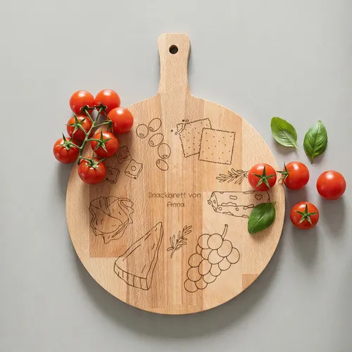 - SnackzeitEigener Name · Holz oder PlexiglasDieses „Snackzeit”-Snackbrett wurde für echte Genießer entworfen. Mit einer verspielten, detailreichen Gravur von Käse, Oliven und anderen Delikatessen versetzt dieses Brett Sie sofort in die richtige Stimmung. <BREAK> Es ist nicht nur ein Servierbrett, sondern eine Hommage an den schönsten Moment des Tages. Dank ihrer runden Form bietet sie reichlich Platz, um Ihre eigenen Kreationen, von Wurstwaren bis Tapas, wunderschön zu präsentieren.Goldfolie0 Fotos